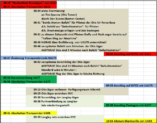 Warum war am 11. September 2001 entgegen jeden militärischen Protokolls alles anders? Warum waren die Piloten der um 09:30 gestarteten Langley Abfangjäger schlechter über das aktuelle Geschehen unterrichtet als die angeblich entführten Passagiere in UA93 (vierte entführte Maschine die der Legende nach in Shanksville abstürzte), weil diese über Mobiltelephone und Airphones mit ihren Angehörigen gesprochen hatten und über das aktuelle Geschehen unterrichtet waren. Ist das logisch oder bleiben da Fragen?
