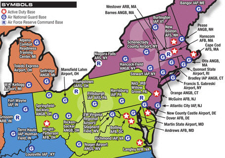 Zum Starten einer kleinen Militärmaschine oder Drohne gibt es sicher viele Möglichkeiten, aber zum Landen eine Boeing 757 wie UA93 oder AA77 kommen neben den zivilen Flughäfen wie Cleveland möglicherweise auch die "Air Force Reserve Command Bases" in Frage, die ich unten aus einer Wikipedia Quelle kopiert habe und mit einem "R" verzeichnet sind. Diese Frage muß man sich stellen, denn laut Commission Report wurde bei der AA77 angeblich um 08:54 der Transponder ausgeschaltet und um 08:56 war sogar das Primärradarsignal verschwunden. Um 09:05 tauchte wieder ein Primärradarsignal auf den Schirmen von Indianapolis wieder auf, das der AA77 zugeordnet wurde. Laut Commission Report war die Maschine für 8 Minuten und 13 Sekunden auf den Schirmen von Indianapolis Center unsichtbar. Das ist einfach physikalisch unmöglich, da eine Boeing 757 kein Tarnkappenflugzeug ist. Auch die Erklärungen im Commission Report sind eher als verzweifelter Versuch zu werten, sich aus der Frage herauszuwinden. (Erklärungen sind "schlechte Radarabdeckung" und "Softwareprobleme")