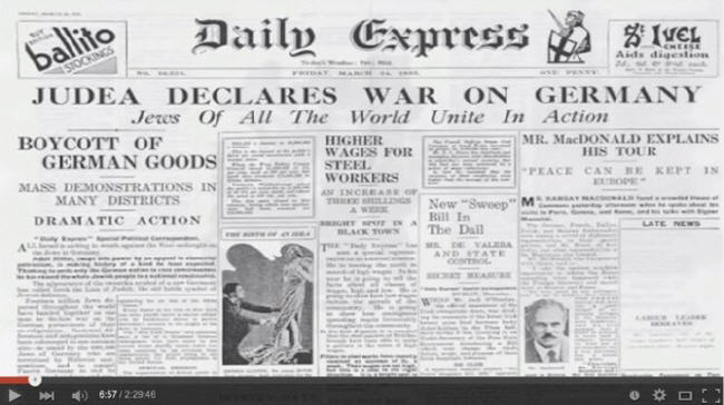 "Die Juden der Welt erkären jetzt einen Heiligen Krieg gegen Deutschland. Wir sind jetzt in einen Heiligen Kampf gegen Deutschland eingetreten und wenn wir sie bis zur Kapitulation hungern lassen. Wir werden einen weltweiten Boykott gegen Deutschland verhängen."