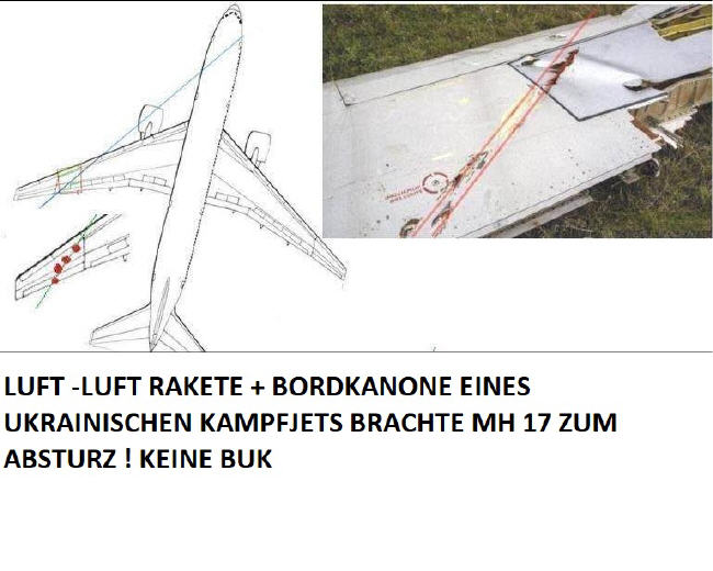 Im folgenden Video wurde recherchiert, dass die MH17 NICHT durch eine BUK Rakete abgeschossen wurde, sondern von einem Kampfjet der Ukraine. Billy Six unterstellt allerdings auch der russischen Regierung bei der Präsentation, keine Rohdaten der Radardaten zu liefern, was der Manipulation Tür und Tor öffnet. Eine sehr gute Recherchearbeit. Es wurden 100 Zeugen befragt, aber niemand konnte bezeugen, dass eine BUK Rakete abgeschossen wurde. Eine BUK Rakete hätte in wenigen Sekunden nach dem Start einen Überschallknall erzeugt, was aber niemand vor Ort bezeugen kann. Außerdem hätte der Chemtrail der BUK für mindestens 10 Minuten in der Luft stehen bleiben müssen, was auch nicht bildlich dokumentiert ist. Der Zeuge, der von der Ukraine präsentiert wurde und den angeblichen Abschuss der BUK Rakete bezeugt, war in der Öffentlchkeit anonymisiert worden. Warum wohl? Die Sache stinkt zum Himmel.