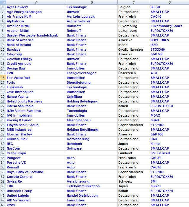 Was halten Sie von der Branche "Umwelt"? Allein dazu bietet die Excelliste bereits 543 Zeilen. Unter Detail finden Sie alle Firmen, die sich mit Solar, Photovoltaik, Biodiesel, Ethanol, Brennstoffzellen, Erdwärme, Hybridtechnik, Abwasserentsorgung, Wasseraufbereitung, Wärmepumpen und mit Windkraft beschäftigen. Sogar Firmen die Lecks in Ölbohrtürmen abdichten sind mit dabei.