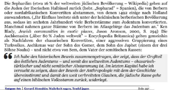 "Die Juden sind die türkische Gruppe und sie bildeten die neue Bevölkerung und herrschen in Judäa seit 537 vor Chr.. Und sie sind nicht semitisch wie die hebräischen Juden und die Israeliten."