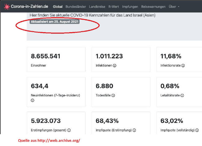 Um die Inzidenz Israels im August 2021 nachträglich herauszufinden, habe ich mich folgender Quelle bedient: http://web.archive.org/.