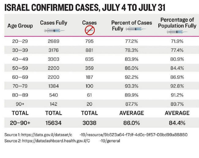 "Das Magazin Science schreibt auf ganz Israel bezogen: „Am 15. August [2021] wurden 514 Israelis mit schweren oder kritischen Covid-19-Erkrankungen ins Krankenhaus eingeliefert … von diesen 514 Personen waren 59 % vollständig geimpft. Von den Geimpften waren 87 % 60 Jahre oder älter.“ Science zitiert einen israelischen Regierungsberater, der erklärt: „Eine der großen Geschichten aus Israel [ist]: ‘Impfstoffe funktionieren, aber nicht gut genug‘.“