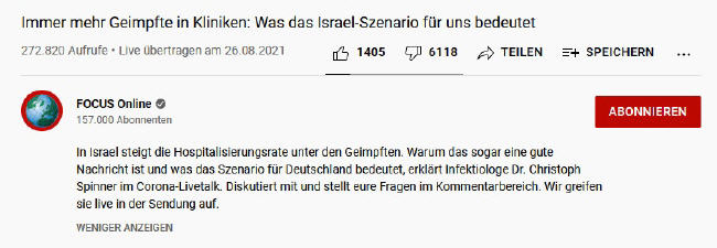 "Als die Infektionszahlen im Juli [2021] wieder stark anstiegen, hat die israelische Regierung rasch reagiert. Bereits Ende des Monats wurde Senioren eine 3. Dosis des in Israel ausschließlich verwendeten mRNA-Impfstoffs BNT162b2 von Biontech/Pfizer angeboten. Bis Ende August wurde die Impfaktion auf alle Altersgruppen über 12 Jahre erweitert. Bereits Mitte September war die Spitze der Infektionswelle erreicht. Mittlerweile gibt es nur noch wenige Infektionen."