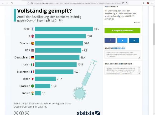 Israel galt doch immer als Impfweltmeister und nun ist es so, dass sogar in Deutschland mehr Menschen zweifach gegen Covid geimpft sind als in Israel. Dies bedeutet, dass Deutschland in der Impfquote Israel sogar überholt hat: